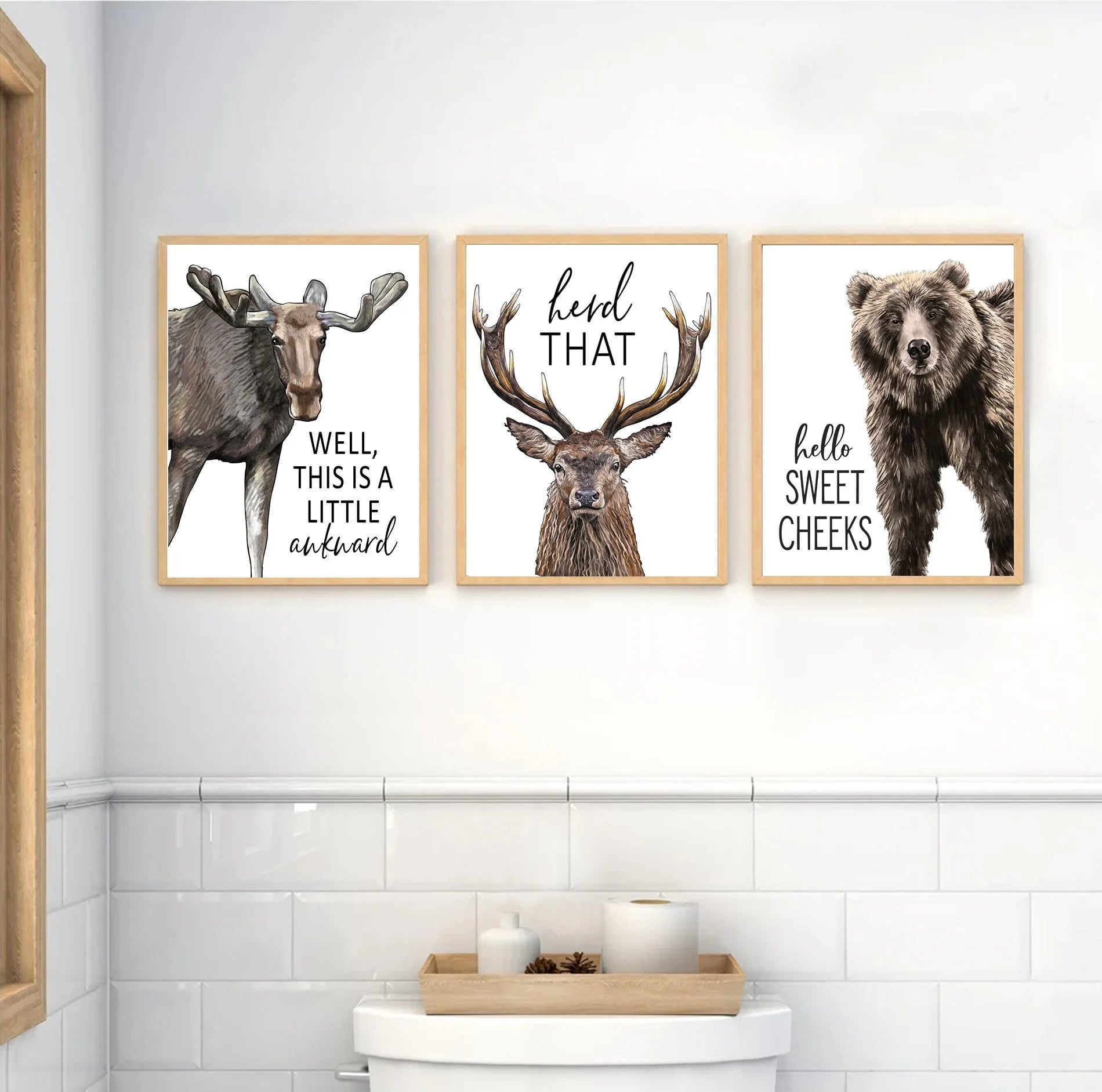 Set of 3 Bathroom Funny Moose, Bear & Deer Canvas
